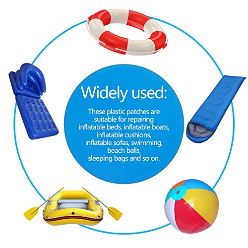 Breed scala aan toepassingen: deze reparatiepatches van kunststof zijn geschikt voor het repareren van opblaasbare bedden, opblaasbare boten, opblaasbare kussens, opblaasbare banken, zwemringen, strandballen, slaapzakken enz.