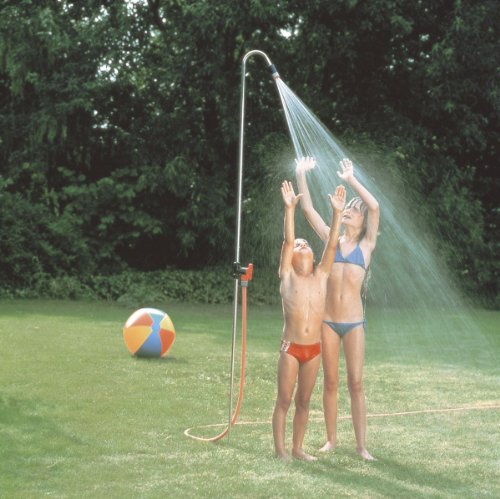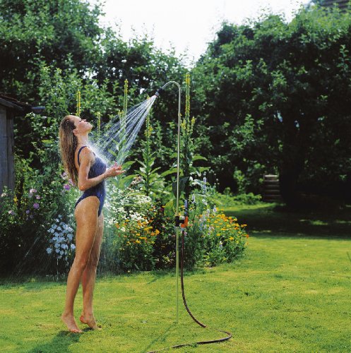 De Gardena buitendouche is snel in de vrije natuur geplaatst. Je kunt ze in het gazon steken of een bijpassende parasolstandaard gebruiken om neer te zetten. Veel plezier bij het douchen.