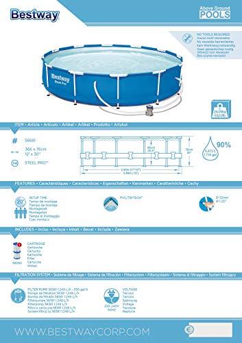Specification: Bestway Steel Pro Frame zwembad, rond 366 x 76 cm, zwembad met stalen frame, met filterpomp, blauw